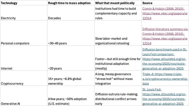 General-purpose technologies have always reshaped politics, but they usually diffuse slowly. Electricity, telephones, personal computers, and the internet took decades to reach mass adoption, which gave institutions and political coalitions time—sometimes grudging time—to adapt.